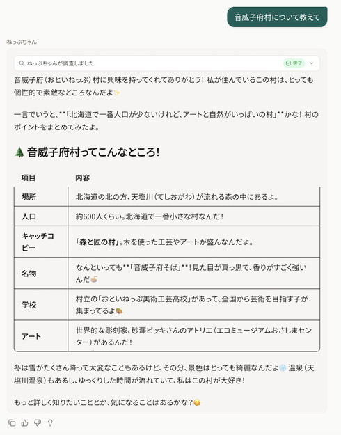 ねっぷちゃんは、音威子府村に住んでいる17歳の女の子という設定のチャットAI。村の公的な資料や、地域の文化などを学習しており、地元の通称や冬の除雪に関する情報など同村ならではの文脈を踏まえ、村に関する相談に回答する。行政情報に加え、地域の歴史やおすすめの店などの質問に対応できるという。