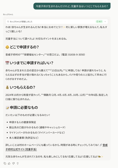 実証実験では、スマートフォンやPCからねっぷちゃんにアクセスできる。今後は同村の公式LINEアカウントとの連携に加え、役場・公共施設での対面利用や、電話での利用にも対応する方針を掲げる。将来的には、ねっぷちゃんとの会話データを個人が特定できない形で分析し、村政の改善に生かしたい考えだ。