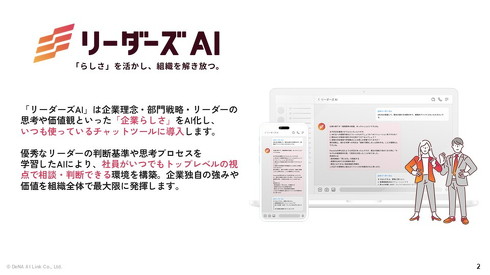 こうした課題に対し、ディー・エヌ・エーの子会社で、AIサービスを手掛けるDeNA AI Link(東京都渋谷区)は、“上司のAI化”という解決策を打ち出した。同社の企業向けAIサービス「リーダーズAI」では、経営層や管理職などの従業員を模したチャットAIを作成し、企業内のチャットツール上で提供する。部下の相談などに対応し、業務の効率化を図る。