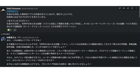 チャットツール上での展開には、使い方などを可視化するという利点もある。例えば、ディー・エヌ・エーでは、AIサービスの企画の社内公募にAI住吉さんを活用しており、100人近くのメンバーが参加するSlackの専用チャンネルでやりとりできる。自分以外のユーザーとAI住吉さんとの会話を見ることで、他人の活用法や準備が進んでいる企画を確認できる。