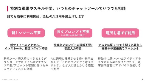 また「Microsoft Teams」や「Slack」など、企業内のチャットツール上でやりとりできる仕様にもこだわった。「従業員の視点からすると、会社が導入した新ツールのアカウントを作成したり、操作方法を学んだりするのはハードルが高い。日々使っているチャットツールのUI・UXに溶け込ませることが重要だ」(犬塚氏)