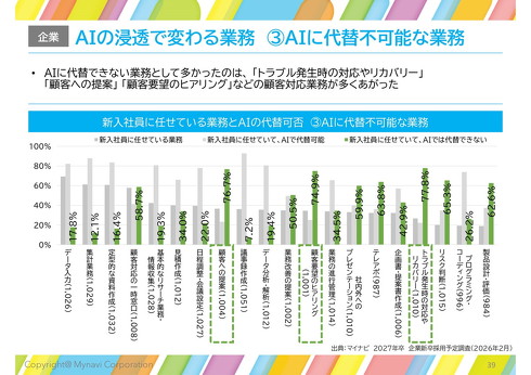 加えて、企業が「AI時代に新入社員に求めるスキル・能力」の1位は、「コミュニケーション力(AIを補完し、人との協働を円滑にする力)」との調査結果も出ているという。マイナビは「コミュニケーションが求められる業務はAIが浸透してもなくならない」としている。