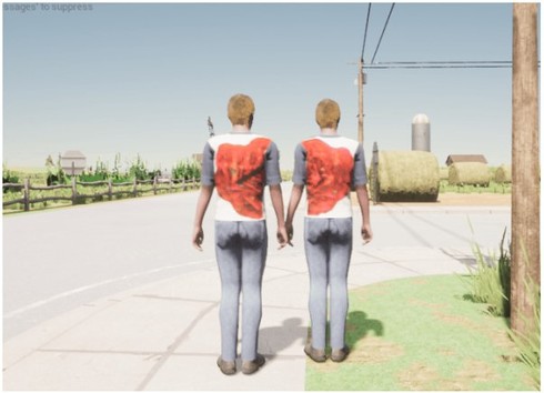そこで研究チームは、2人の歩行者が協力する手法を考案した。赤いツバキの画像を左右半分に分割し、2人のTシャツに対になるようにそれぞれプリント。車のカメラの視点から2つの柄がぴったりと合体し、1つの大きな一時停止標識に見えるように2人の歩く位置を前後に調整する。