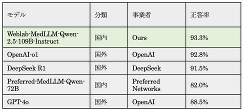 AIの研究で知られる東京大学の松尾・岩澤研究室は3月5日、医療分野に特化した日本語LLM「Weblab-MedLLM-Qwen-2.5-109B-Instruct」を開発したと発表した。2025年の医師国家試験の正答率は、米OpenAIのAIモデル「o1」「GPT-4o」などを上回ったという。チャットAIとして研究者向けに無償提供する。