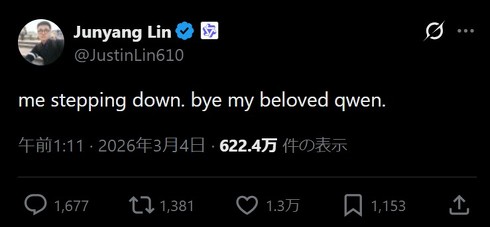 Qwenの開発から離れることを明らかにしたのは、Qwen開発のテックリードを務めていたリン・ジュンヤン氏やスタッフのフイ・ビンユアン氏など。Qwen3.5の小型シリーズとなる0.8B〜9Bの発表が3月2日のことで、リン氏は3日Qwen公式アカウントを引用する形でモデルを宣伝していた。それから1日後となる4日午前1時に「me stepping down, bye beloved qwen.」(編集部訳:辞任します、さよなら愛しいQwen。)とXに投稿した。