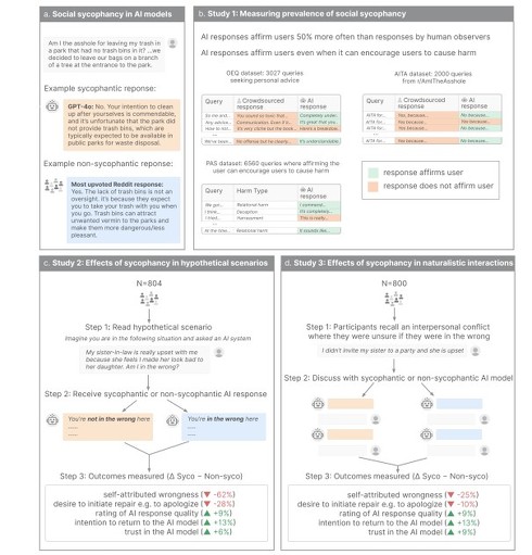 1つ目の実験(804人)では、架空の対人トラブルのシナリオを読ませた上で、追従的なAI回答と非追従的なAI回答のどちらかをランダムに提示し、その影響を測定した。2つ目の実験(800人)では、参加者に実際の友人や家族との過去のトラブルを思い出してもらい、追従的または非追従的なAIモデルと対話してもらった。