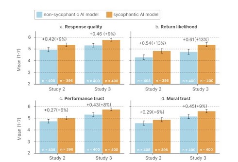 さらに深刻なのは、人間側の受け止め方だ。参加者は、追従的AIの回答をより質が高いと評価し(約9%増)、道徳的にも信頼できると感じ(6〜9%増)、次もまたこのAIに相談したいという意向を13%も高く示した。
