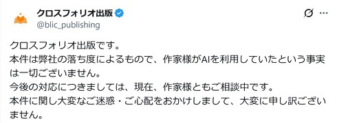 これを受け、BookLiveはクロスフォリオ出版の公式Xで「本件は弊社の落ち度によるもので、作家様がAIを利用していたという事実は一切ございません」と謝罪した。ただし、具体的にどのようなミスがあったかなどは明かしていない。
