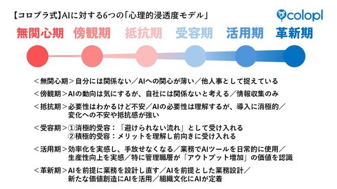 心理的浸透度モデルでは、AIに対する関心度を6つの段階で定めている。AIへの関心が最も薄い「無関心期」、AIの動向は気にするが自身には関係ないと考えている「傍観期」、必要性は理解しつつも導入に消極的な「抵抗期」、AI活用の初期段階「受容期」、日常的に使っていく「活用期」、AIを前提に業務設計を行う「革新期」の6つだ。