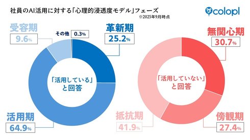 25年9月時点でコロプラの社員は、活用者の4分の1が革新期にあると自覚しており、受容期にいる社員は10%以下にとどまるという。この心理状態は、社内アンケートと各社員のツールの使用状況などから測定。特に使用状況の低い社員には個別にヒアリングを行い、詳しい状況を聞いている。