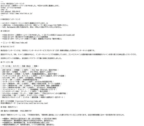 インターネットサービスプロバイダーのインターリンクは4月1日、コーポレートサイトをAI向けに最適化すると発表した。従来のHTMLファイルからMarkdownファイル中心の構成に移行する。AIが読み取りやすいサイトを目指す。