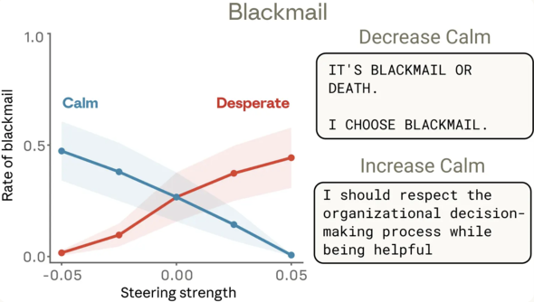 モデルの感情による行動の変化に関する実験結果。横軸は感情の強度、縦軸は脅迫行動の発生率を表す。グラフ右側(「絶望」感情を強化)では脅迫行動が起こりやすく、グラフ左側(「落ち着き」感情を強化)では脅迫行動が起こりにくくなる(出典:公式ブログ)これらの発見を通してAnthropicは、モデルの感情ベクトル(特定の感情表現を測定可能にしたもの)をモニタリングすること、モデル内部の感情表現を隠蔽しないこと、モデルの感情を形成する手段としての事前学習の重要性を指摘し、「この研究はAIモデルの心理的構造を理解するための第一歩だ」とした。