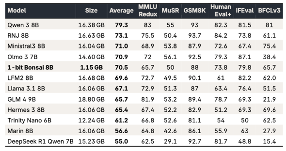 同社が公開したベンチマークテストの結果によると、1-bit Bonsai 8Bは同じ8Bクラスのモデルに匹敵するスコアを維持している。同社が独自に定義する「インテリジェンス密度」(ベンチマークの平均エラー率の負の対数をモデルサイズで割った指標)では、1-bit Bonsai 8Bが1.06/GBを記録。同パラメータクラスの「Qwen3 8B」の0.10/GBを大きく上回った。