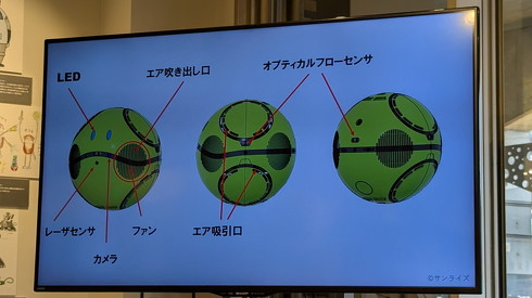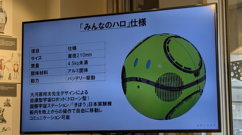 みんなのハロの直径は210mm、重さは4.5kg未満。ボディーはアルミ製で、バッテリーで駆動する。プロペラを内蔵しており、“ほっぺ”にあたる部分から空気を吹き出すことで、全方位に移動できるという。周囲を認識するレーザーセンサーやカメラ、通信用マイクなども備える。