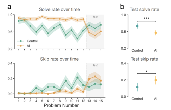 「AI Assistance Reduces Persistence and Hurts Independent Performance」(AIによる支援は粘り強さを低下させ、自立したパフォーマンスを損なう)と題した論文では、AIの利用が人間の独力での問題解決能力と粘り強さに与える因果的影響を、1222人を対象としたランダム化比較試験で検証した。