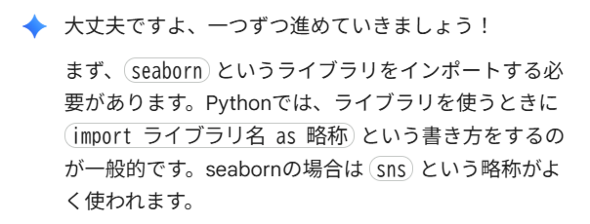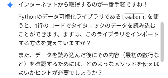 「全く覚えてません」と言うと、ライブラリをインポートする「import」文と、「seaborn」ライブラリのデータを読み込む「load_dataset()」関数の書き方を説明してくれた。同時に「読み込んだデータは df などの変数に代入しておくと、後で操作しやすくなりますよ」とも案内し、代入の方法も案内してくれた。ここまでの全ての案内においてGeminiは、コピー&ペーストして使えるコードを記述するのではなく、あくまでコードの書き方の指南に徹していた。
