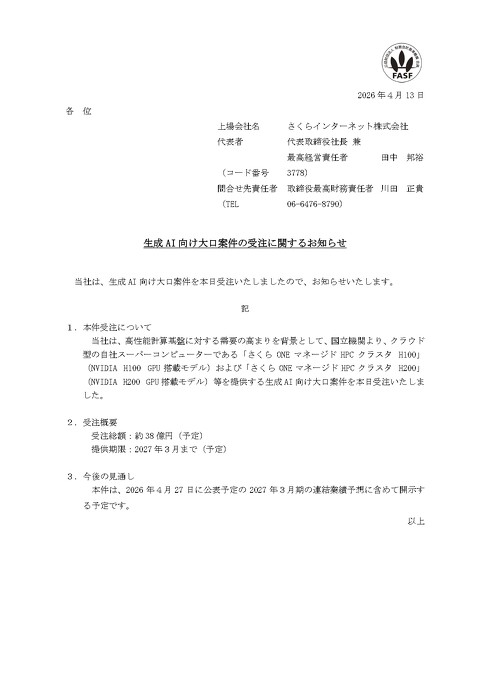 さくらインターネットは4月13日、国立機関から生成AI向けの案件を受注したと発表した。受注総額は約38億円で、期間は2027年3月までの予定。同社のクラウド型コンピュータ「さくらONE」(米NVIDIAのGPU「H100」「H200」搭載モデルなど)を提供する。26年4月27日に公表予定の2027年3月期連結業績予想では、本件の影響を含めた上で開示する。