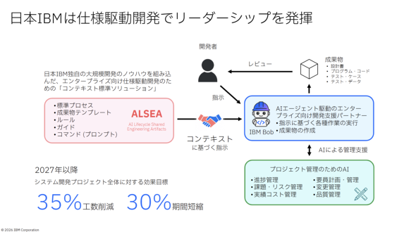 日本IBMは2027年以降、AI駆動開発の推進によって同社のシステム開発プロジェクト全体で35%の工数削減と30%の期間短縮を目標に掲げる。ALSEAは4月14日から先行プロジェクト向けに提供を開始し、一般提供は2026年下期を予定する。