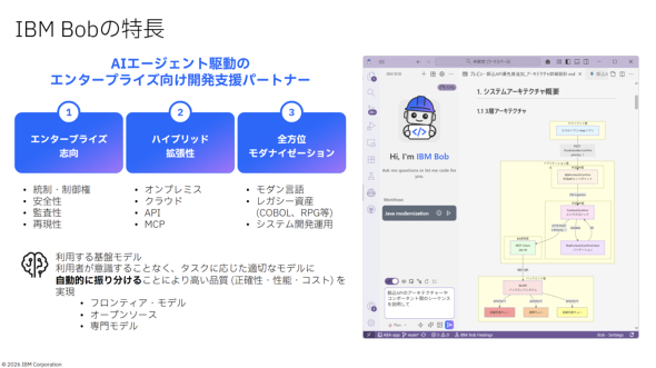 その土台となるのが、同社が3月に一般提供を開始したAIエージェント駆動型の開発支援パートナー「IBM Bob」(以下、Bob)だ。ユーザーの指示に応じて最先端モデルを含む複数のモデルを使い分けることで、高品質なシステム開発が可能になったとアピール。髙橋氏はBobを「スーパーエンジニア」と表現し、IBM社内では既に7万人以上の従業員が利用していると述べた。