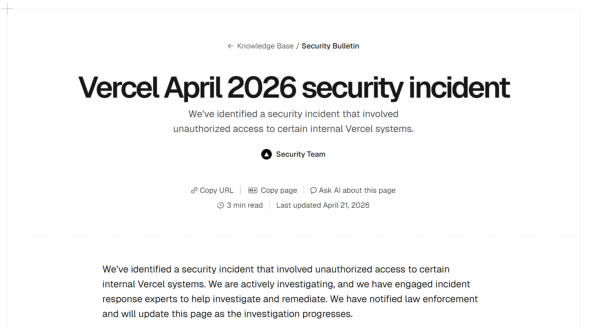 Webホスティングサービスを展開する米Vercelは4月19日(現地時間)、同社システムに不正アクセスがあり、一部のユーザーの環境変数が流出した可能性があると発表した。侵入の起点となったのは、同社従業員が利用していた、既にサポートが終了しているAIツール「Context AI Office Suite」だった。