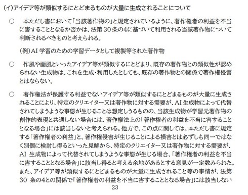 簡単に紹介しますと「考え方」の基本的な整理は、作風や画風はアイデアであり、アイデアは著作権法上保護されないため、作風や画風が類似する作品が大量に生成される場合も「著作権者の利益を不当に害することとなる場合」には当たらない、というものです。