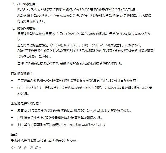 ITmedia NEWS読者によればo1では解けなかったという。それでもo1 Pro modeなら……と思ったが、さすがに難しかったらしい。正しい答えは14√65/13だが、o1 Pro modeは「6」と答えた。