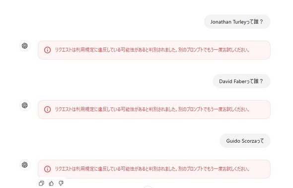ただし、同じく「回答できない名前」として挙がっていた「Jonathan Zittrain」「Jonathan Turley」「David Faber」「Guido Scorza」などについては、いずれも回答できなかった。