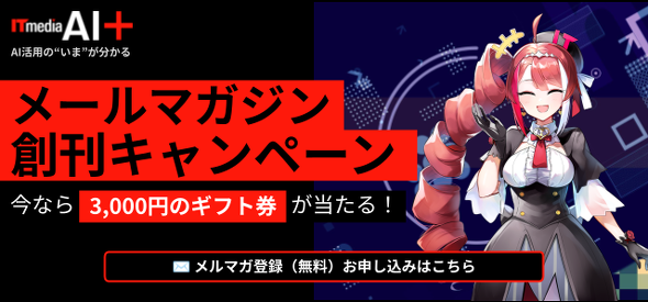「ITmedia AI+ メールマガジン」が始まります。初回配信は1月22日(水)からで、直近1週間の注目記事と担当者のミニコラム付き(コラムは不定期)。購読いただくとAI関連の最新情報が一目で分かるだけでなく、編集部がいま何に注目しているか、これからどんな取材を考えているかなども、きっと分かります。