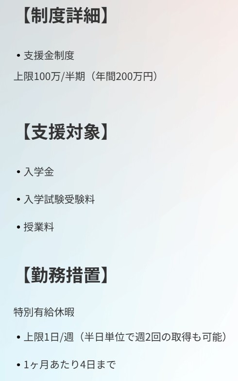 原則として、研究テーマは業務に関連し、在学中に業務への貢献がある内容に限る。入学金や受験料、授業料を最大で年間200万円(半期上限100万円)支援する。勤務措置として週に1日(1カ月あたり4日まで)の特別有給休暇も与える。