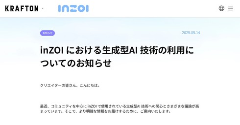 今回の声明の背景として、同社は「最近、コミュニティーを中心にinZOIで使用されている生成型AI技術への関心とさまざまな議論が高まっている」と指摘。「より明確な情報を届けるため」AI技術に関する説明をしたという。