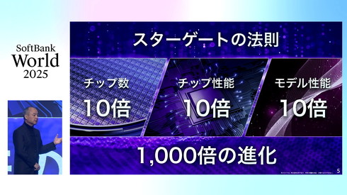 孫氏は1月に発表した、ソフトバンクGと米OpenAI、米OracleによるAIインフラ構築事業「Stargate Project」にも言及した。同事業は、1回のサイクルでチップの数と性能、AIモデルの演算性能をそれぞれ10倍に増設し「1000倍ぐらい(AIの)能力がアップする」との法則に基づいていると説明。このサイクルを3回実施すると、10億倍になるとアピールする。