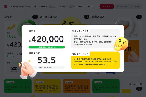 AIレコメンド機能による改善策は、感動スコアやハピネススコアなどのデータを可視化する「ハピカンダッシュボード」で表示する。12月から丸亀製麺の全店舗で運用を始め、店長の判断や店舗運営をサポートする。なお、ハピカンダッシュボードは、SaaS事業などを手掛けるプレイド(東京都中央区)とともに開発した。