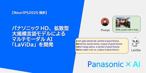 パナソニック ホールディングス(パナソニックHD)と傘下の米パナソニックR&Dカンパニー オブ アメリカは11月27日、主に画像生成AIに利用する「拡散モデル」で文章を生成するマルチモーダルAI「LaViDa」を開発したと発表した。米カリフォルニア大学ロサンゼルス校の研究者と協力。従来の文章生成で多く使われる「自己回帰型モデル」の一部に比べ、処理を高速化したという。