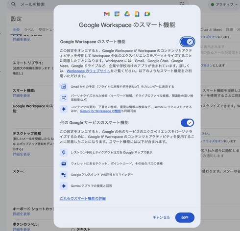 特に注意すべきは、スマート機能がデフォルトで有効になっている場合があることだ。無効化を希望する場合は、Gmailの設定から手動で変更する必要がある。
