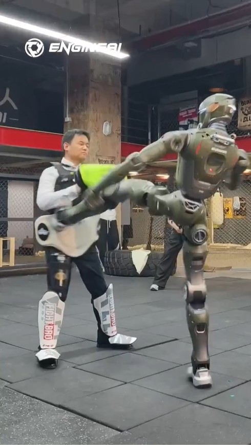 ロボット開発企業の中国EngineAIは12月6日(日本時間、以下同)、同社の人型ロボット「T800」が同社の趙同陽CEOを蹴り倒す動画を、公式Xで公開した。トレーニング施設で、T800は全身に防具を付けた趙CEOの腹部をキック。趙CEOが背後に倒れ込む様子が映されている。T800の運動性能をアピールしているようだ。