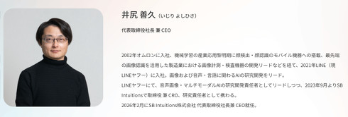 井尻氏は2002年オムロンに入社し、機械学習を使った顔検出・顔認機能を持つモバイル機器などを開発。その後21年に、LINE(現LINEヤフー)に入社した。入社後は、画像と音声・言語に関わるAIの研究開発をリード。LINEヤフーで音声画像・マルチモーダルAIの研究開発責任者を担当した後、23年9月からはLINEヤフーと兼任の形で、SB Intuitionsの取締役兼CROを務めている。