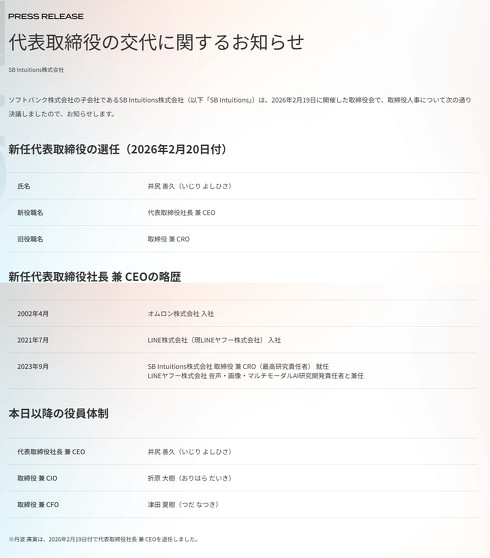 ソフトバンクの子会社でAIの研究開発などを手掛けるSB Intuitions(東京都港区)は2月20日、代表取締役を交代すると発表した。これまで同社の取締役兼CRO(最高研究責任者)を務めていた井尻善久氏が同日付で代表取締役社長兼CEOに就く。