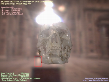下の2枚の画面は、Masaki Kawase氏によるHDRレンダリングデモ(http://www.daionet.gr.jp/~masa/)をRADEON9500以上とGeForce FX系で動作させた結果だ。なお、DeltaChromeやVolariの結果も実質的にはGeForce FX系の結果と同じになる。このデモは非常によくできていて、動作させたハードウェアに適したHDRレンダリングモードを選択する設計になっている。RADEON9500以上では「D3DFMT_A16B16G16R16」が使えるので、これを使って正しいHDRレンダリングを行う。一方、GeForce FX系ではDirect X 9で新設されたバッファが使えないために、上記で説明したようなDirect X 8世代の「D3DFMT_A8R8G8B8」を使ったHDRレンダリングを行う。