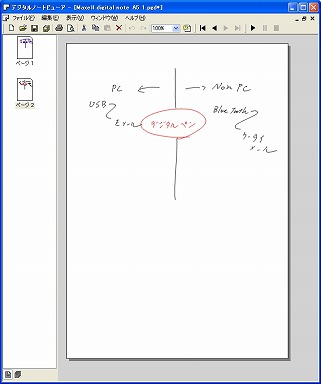 書いたあと、PCにデジタルペンを接続すれば、データ転送が行なわれる。閲覧するのは「デジタルノートビューワー」というソフトで、見た感じはAdobe Acrobat Readerの簡易版のようだ。書いたデータは、パーツごとに別々に拾い上げて、コピーや場所移動など、自由に編集することができる。さらにWordやPowerPointに画像データとしてエクスポートする機能もある。