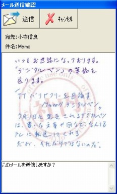 そこまで準備ができたら、あとはビジネスメール用紙に書くだけだ。内容を書いて、送信したい相手のマスにチェックを付け、送信にもチェックを付けておく。あとはPCと接続するだけで、勝手にメールが送られていく。メモ自体はJPEG添付となっており、ケータイなどにもメールできる。