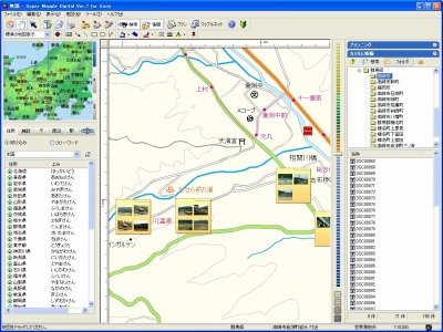 さて、写真に位置情報を埋め込んだのはいいが、それをどうやって活用するか、が問題だ。GPS-CS1Kには付属ソフトとして、「Super Mapple Digital for SONY」という地図ソフトがバンドルされている。ここに位置情報が埋め込まれた写真をまたドラッグ&ドロップすると、地図上の該当する場所に写真が貼り付けられる。これで地図を見ながら写真を追っていく、あるいは写真を追って地図を見ることができる。