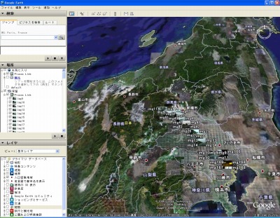 Picasa2に取り込んだ写真のフォルダを選択しておき、メニューから「View in Google Earth」を選択すると、Google Earth上に写真が配置される。あとは通常Google Earthを楽しむように、パースを付けたり地球からズームインしたりして遊べるわけである。