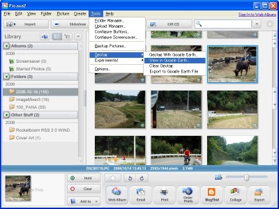 地図と連動させたい場合は、Googleが提供する「Picasa2」という写真管理ソフトを使うのがお勧めだ。現在Picasa2の英語版βでは、GPSデータを格納した写真とGoogle Earthとを連動させる機能が追加されている。