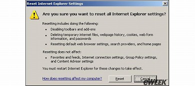 カスタムオプションでブラウザが不安定になったら、リセットオプションでIE 7をデフォルト設定に戻せる。