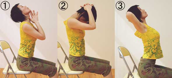 首、肩、肩甲骨などストレスがたまりやすい箇所を伸ばすポーズ。@胸の前で合掌した姿勢でゆっくり首をうしろに倒す。A手は頭のうしろ、おへそをのぞき込む。B頭に手を置いたまま、ゆっくりと上体を反り胸を開いた姿勢に