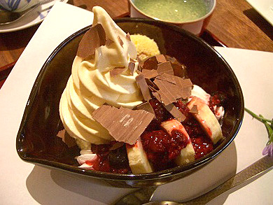 木苺とチョコレートという組み合わせに即決。世の中いろんな組み合わせのパフェがありますが、中でも“○○ベリーとチョコ”の組み合わせはずるい。バニラ風味の濃厚なソフトクリーム、その後ろに隠れるロールケーキ、チョコアイス、木苺、ホイップクリーム、バナナ、ぱらぱらかかっているチョコ……また食べに行こ♪