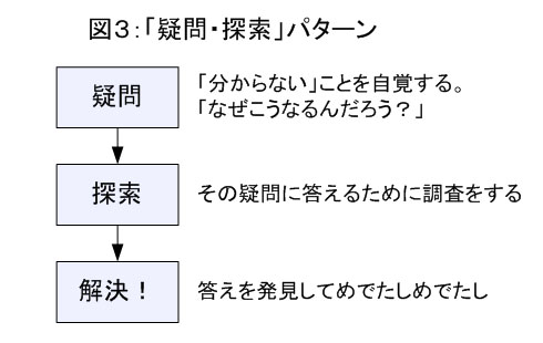 もうひとつ、「疑問・探索」というパターンも紹介しておきましょう。これは、「疑問」をはっきり意識してからそれを「探索」する努力を重ねて解決するというものです。