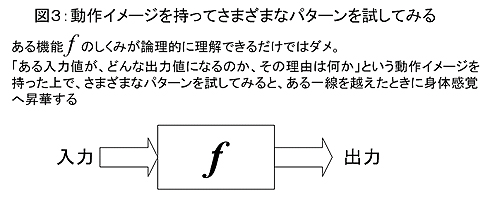 しかしこれは身体を使うものに限らず、理屈をこねる活動についても同じなんです。図3に、よく「関数」の説明をするときに使われる図を載せました。入力に対して決まった処理を行い、出力をする働きを抽象的に表現したのが関数「f」です。fは2次関数でも3次関数でも三角関数でも、あるいは運動方程式でも何でも構いません。この時、「f」のしくみが論理的に理解できただけではだめです。それでは実用的には使えません。