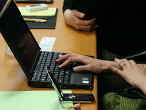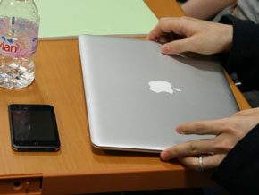 3人が持ち歩いているもの。上段が笠谷さんのMacBook AirとiPod touch(左)と、最近開発したという「PocketGuitar」で演奏中の写真(右)。ギターネックに見立てたiPod touch上の弦を弾くと、ギターの音が鳴る。下段が閑歳さんのPCと「SoftBank 920SH」(左)と、寺島さんの「au WIN31T」Copyright © ITmedia, Inc. All Rights Reserved.