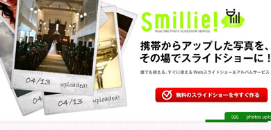 作り始めてみたら1週間ぐらいでSmillie!は完成した。このサービスは、ケータイで写した写真をメールで投稿すると、即座にSmille!のサーバにアップされ、スライドショーとして再生できるサービスだ。退官パーティーでは、みんなが写真を投稿できるメールアドレスを配った。